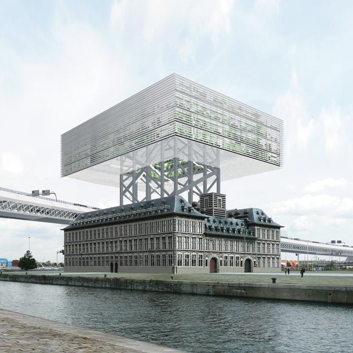 In 1999 architectural firm Rapp + Rapp was founded by Christian Rapp, now the city architect of Antwerp, and his wife Birgit Scheulen. Their design consist of two towers which are connected. The towers would come on top of the old fire station. Form and typologie refer to the industrial architecture of the port. The top floors of the towers are for technical installations. The facade on the south would be partly destroyed to open the courtyard . At the courtyard would come a mirroring pont.