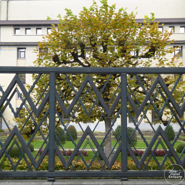 The garden on the Kronenburgstraat side is “special”. It is lower than the street and has a few footpaths. The garden itself is also protected. The pond and fountain in the extension of the entrance gate also has a functional function. Above the water surface there are grilles and fans that suck in and spread the fresh, moist air into the building. For a building where hygiene and clean air are super important, much nicer than today’s air conditioners.