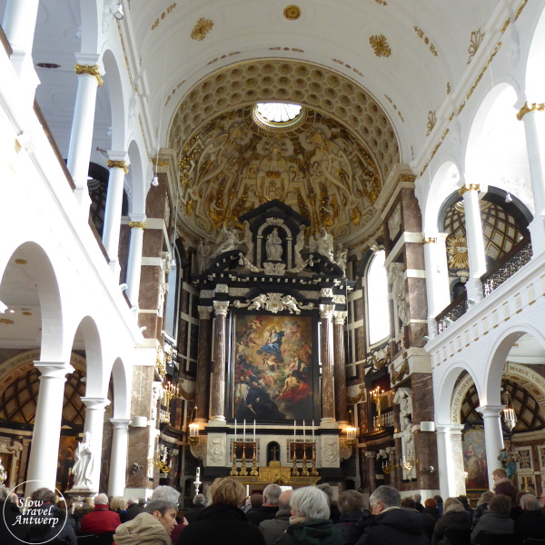 The painting that is now hanging here will be changed back on Easter Monday. From then on, “Our Lady of the Carmel” by Gustaaf Wappers from 1840 can be seen. Be sure to check it out, because it is a unique spectacle. The technology is almost 400 years old and it is the only place in the world where they still change the paintings. The paintings are 5.35 meters high and 4 meters wide.