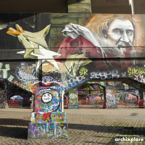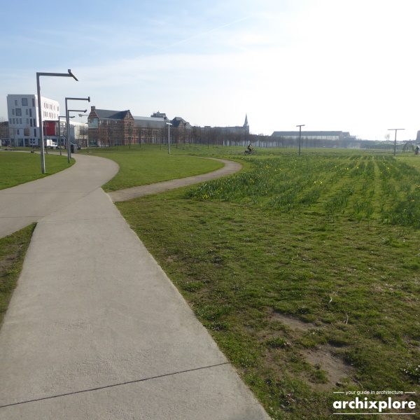 You will also find no bushes, only trees. This increases the sense of security and also a positive point: it is a saving measure. But the soil also had to be cleaned up and to keep it economically viable, a part was reserved for buildings on the west side. The NMBS received 192,000 m² for building rights and to keep as much park as possible, high-rise buildings were used (and they are tall buildings, see the list of the highest buildings in Antwerp). The parc was 18 hectares in size, including a BMX and skatebowl and graffiti. The cycle paths are usually also duplicated, so they look like train tracks.