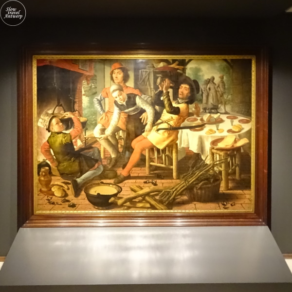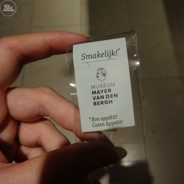 Het Museum Mayer Van den Bergh is bezig zichzelf een hippere uitstraling te geven. Getuige hiervan onder andere het nieuwe logo dat het portret voorstelt van de verzamelaar Mayer Van den Bergh. Het zou niet misstaan bij een koffiebar. Ook in de tentoonstelling heeft men iets niet-alledaags gestoken: naast het schilderij ‘Boerengezelschap bij de Haard’ van Pieter Aertsen staat een box met snoepjes. De suppoost vertelde me dat er verschillende snoepjes zijn met smaken uit het schilderij. Het kan dus evengoed slecht smaken, lachte hij, verwijzend naar de mosselschelpen die afgebeeld zijn. Ik heb het snoepje dan ook niet durven opeten, eerlijk gezegd.