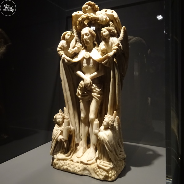 Je kan gebruik maken van de Antwerp Museum App voor een toer in de tentoonstelling, elk werk in de tentoonstelling is vertegenwoordigd in de app met een klein tekstje. Zoals bovenstaand werk met prachtige details: de ‘Man van Smarten’, een albasten werkje uit de vijftiende eeuw.